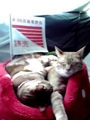 「箱根駅伝」近所を走るのです。応援用にもらえる旗と猫たち♪